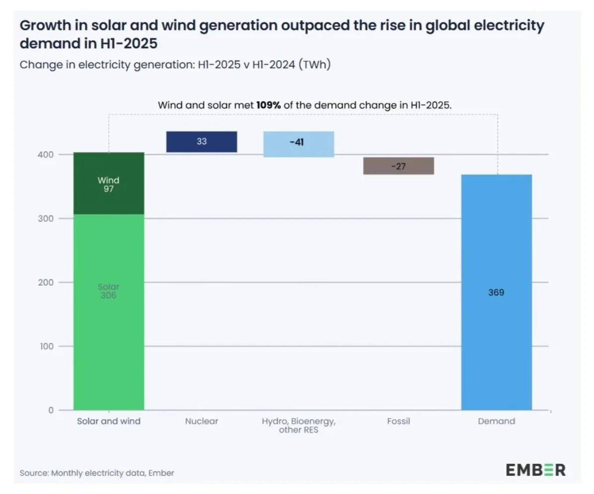 Solar and wind outpaced demand growth in the first half of 2025, as renewables overtook coal’s share in the global electricity mix.